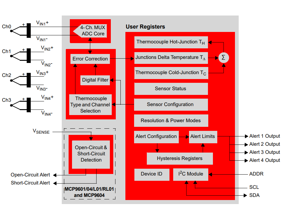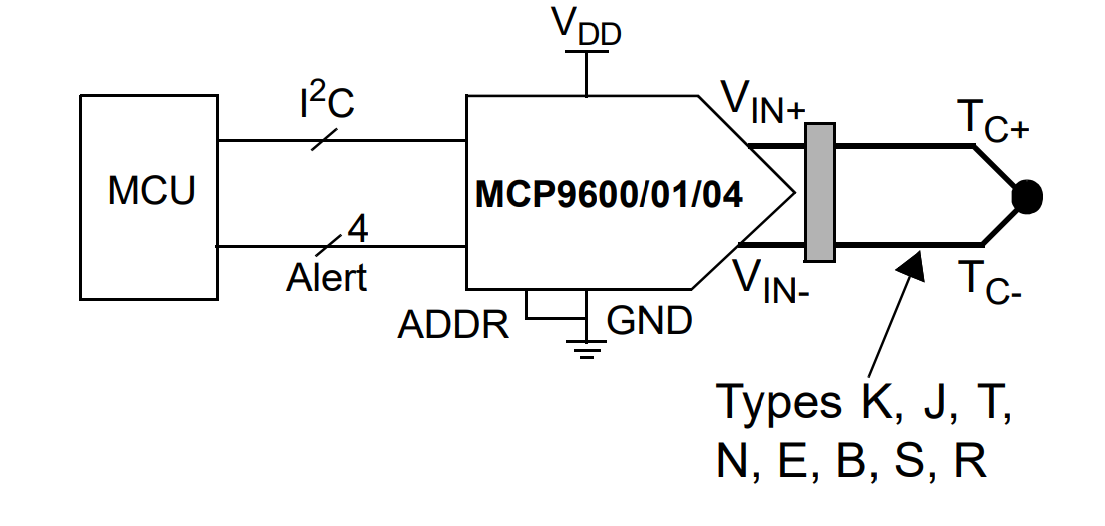 Converting thermocouple analog information to readily processable digital temperature data requires computation. The MCP9604 family provides a comfortable external processor. As shown in the figure below, the host microcontroller uses the I2C bus to configure the chip, which then provides a stream of digital temperature data.