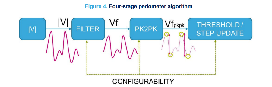 Developers working on augmented health applications will be pleased to learn that a pedometer algorithm has been implemented. Its structure is shown in the figure, with additional information available in the data sheet.