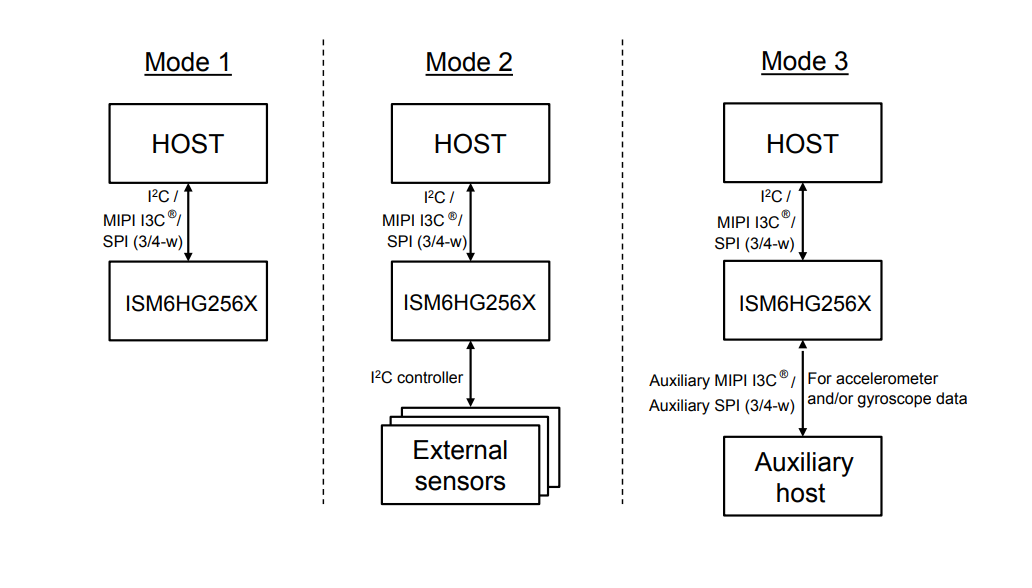 For data communication, the ISM6HG256X offers three configurations for maximum application flexibility. The host can contact the IMU using either I2C, I3C, or SPI. The IMU can connect to sub-sensors, thereby reducing bus contention as shown in the figure below.