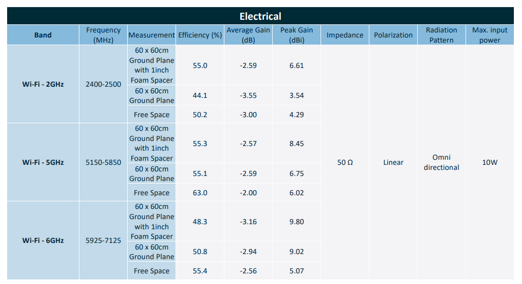 Taoglas provides a variety of radiation diagrams in the SPKW.46.8.01 data sheet. In general, the antenna is omnidirectional, which means that the speaker\'s physical placement does not affect signal strength. Furthermore, the maximum input power of 10 W allows the component to be used for other non-WiFi modulation schemes in the 2.4, 5, and 6 GHz bands.