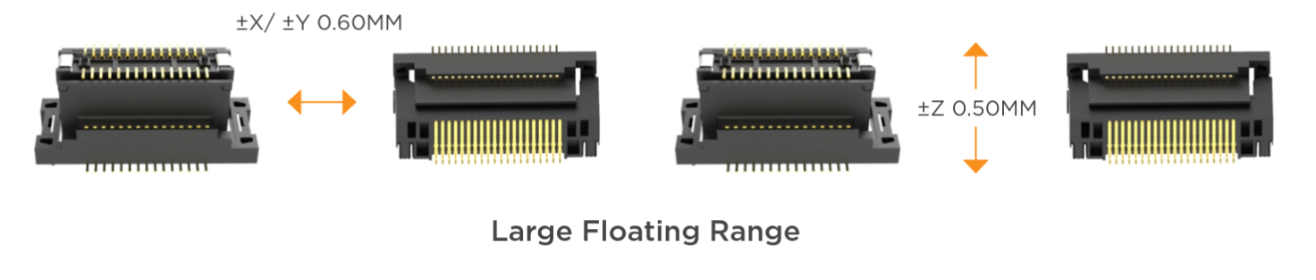 Our connector housing contains both fixed part and the floating part, and they work together with spring contacts to support the movement.