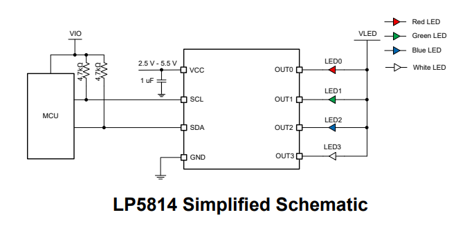 Light-emitting diodes perform best when driven in constant-current mode. The Texas Instruments LP5814 achieves this by acting as a current sink. As shown in the figure below, the four individual color components are connected to the power supply, with grounding controlled by the integrated circuit's drive transistors.
