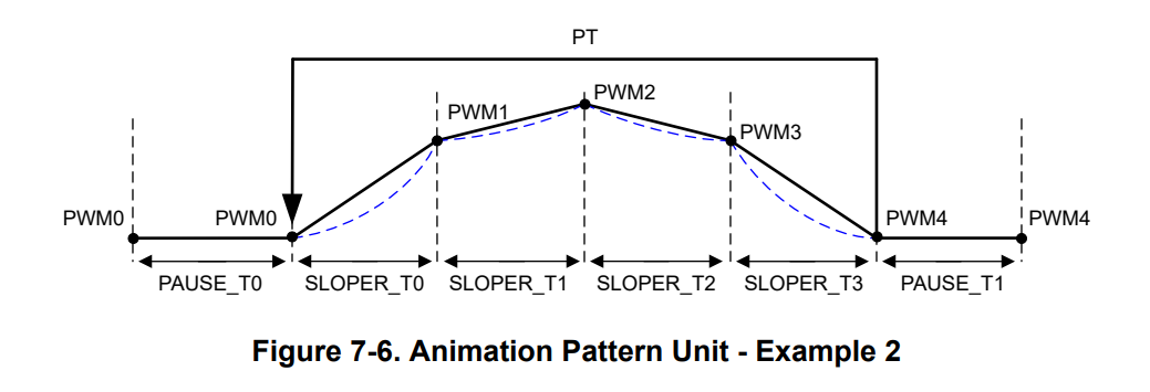 In particular, a total of 5 PWM-support waveform points are visible. The animation engine toggles between these five automatically, with a pause time being added for additional programming flexibility. The sloper ensures that the transitions between the individual modes are as smooth as possible.