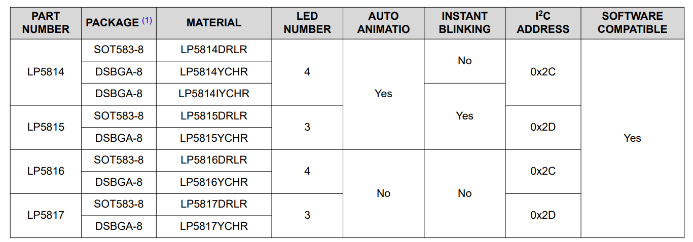 Texas Instruments provides engineers with an array of LED controllers. The LP5814 family, embodied by SKUs such as LP5814DRLR and LP5814YCHR, is intended for scenarios where four LEDs - usually red, green, blue, and white - are to be driven. If a system can make do with only three LEDs, SKUs such as LP5815DRLR and LP5815YCHR perform at a lower cost. Furthermore, a variety of SKUs, such as LP5816YCHR, just provide the constant-current function and omit the animation feature for additional cost savings. The table below provides an overview of the various versions.