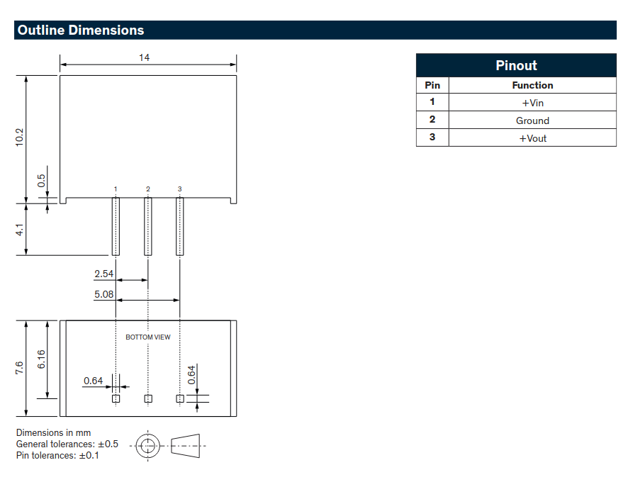 The TSR 3N family comes in a SIP3 package with dimensions of 14 x 7.6 x 10.2 mm. One interesting aspect of the pinout is compatibility with the above-mentioned linear regulators -- the figure below shows that the component has the same pin assignment. With mechanical clearances present, the component can be used as a plug-in replacement for the existing integrated circuit.