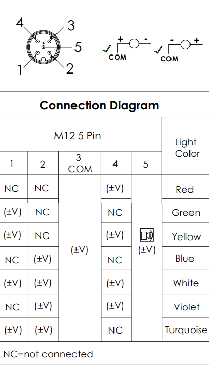 In addition, some members of the family include a buzzer. Thanks to the maximum loudness of 85 dB, the system is clearly audible even on noisy factory floors. The technical manual, found at https://www.werma.com/media/b6/f6/f7/1747664332/3432050.pdf, then provides the instructions shown below. The industry-standard M12 connector must be energized in various ways to select the desired color and buzzer activity status.