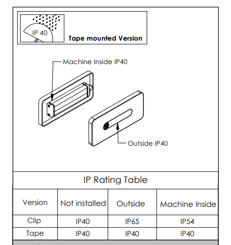 When integrated correctly, Werma provides ratings of up to IP 65 - this is more than sufficient for most plant environments. The actual humidity resistance of the completed assembly depends on the installation and the version of the light deployed. In some cases, IP40 is reached - the figure below provides an example overview for the tape-mounted version.